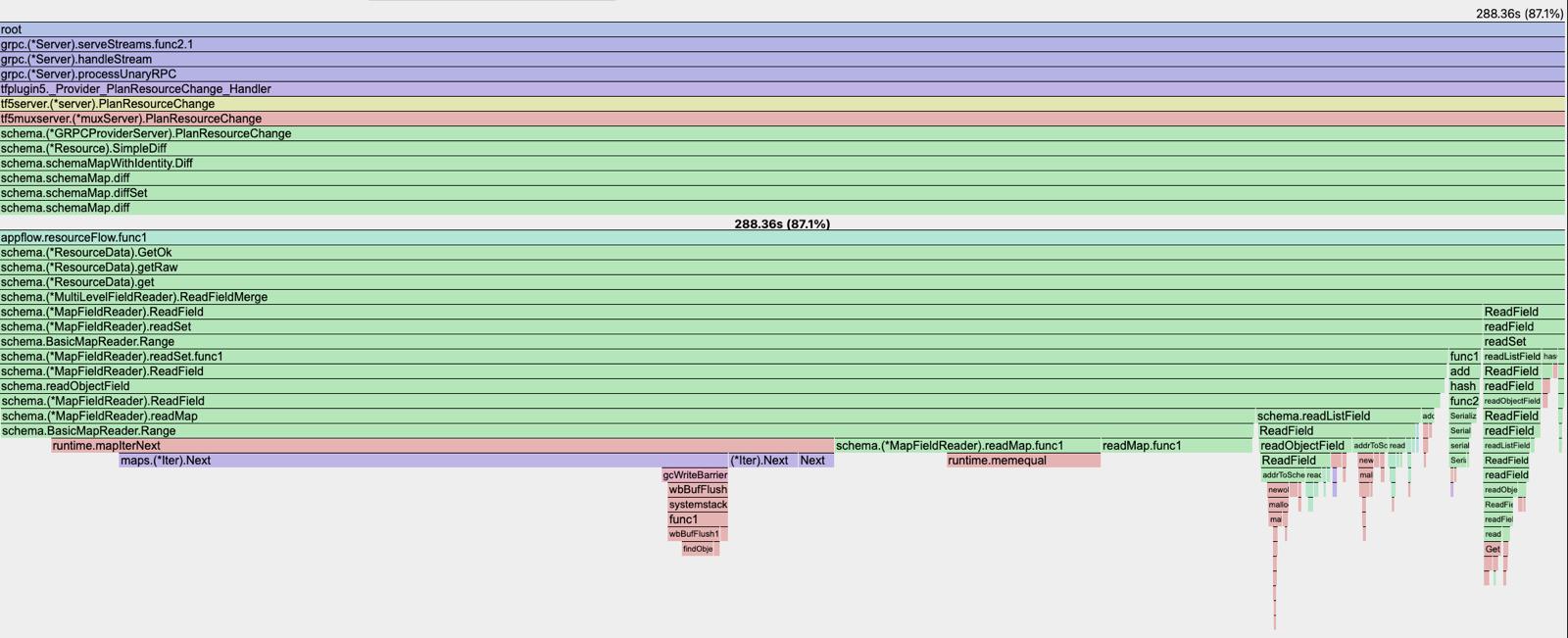 Aha — we can see immediately that the diff function is indeed part of the call to the most expensive function, and digging into this we can see an anonymous function appflow.resourceFlow.func1, which is likely our diff function, which then calls d.Get().